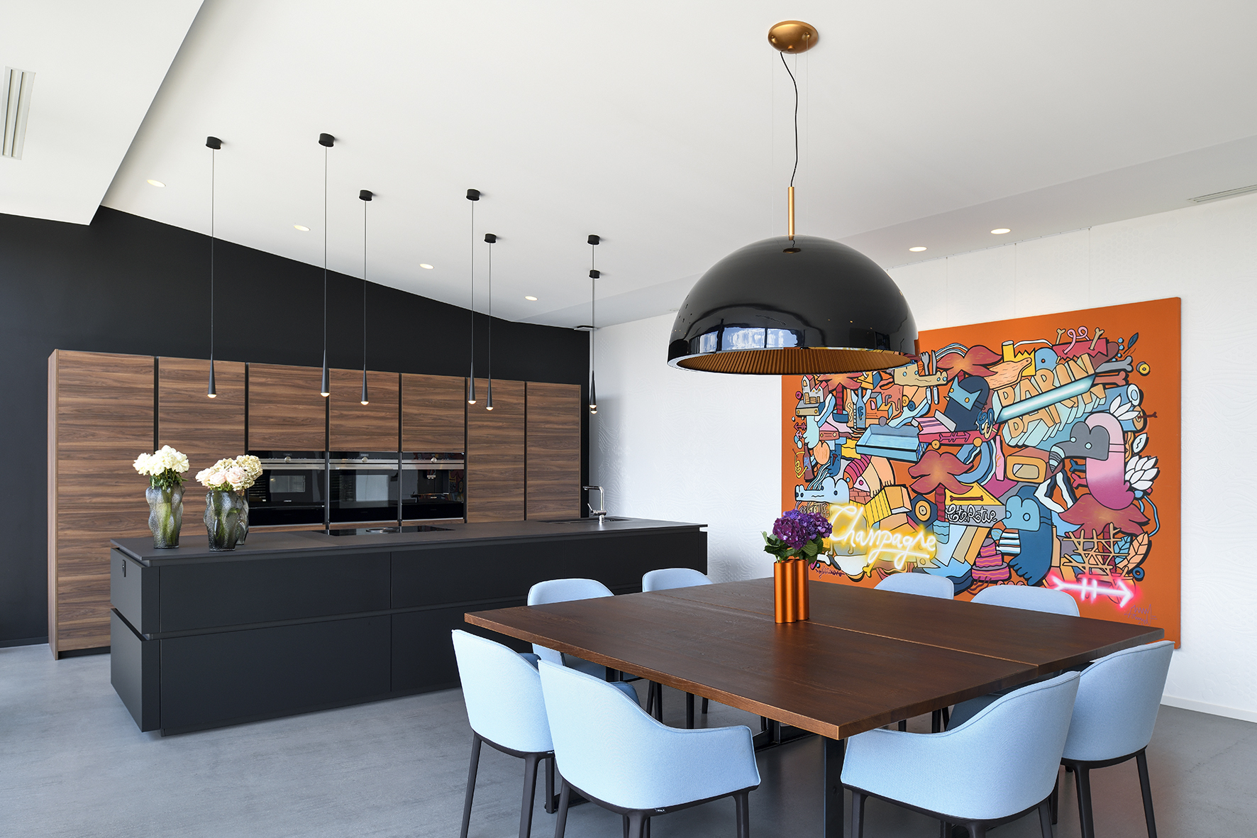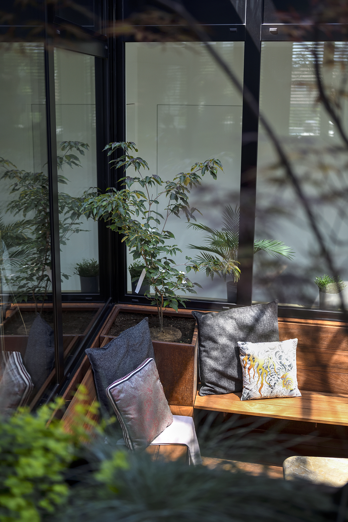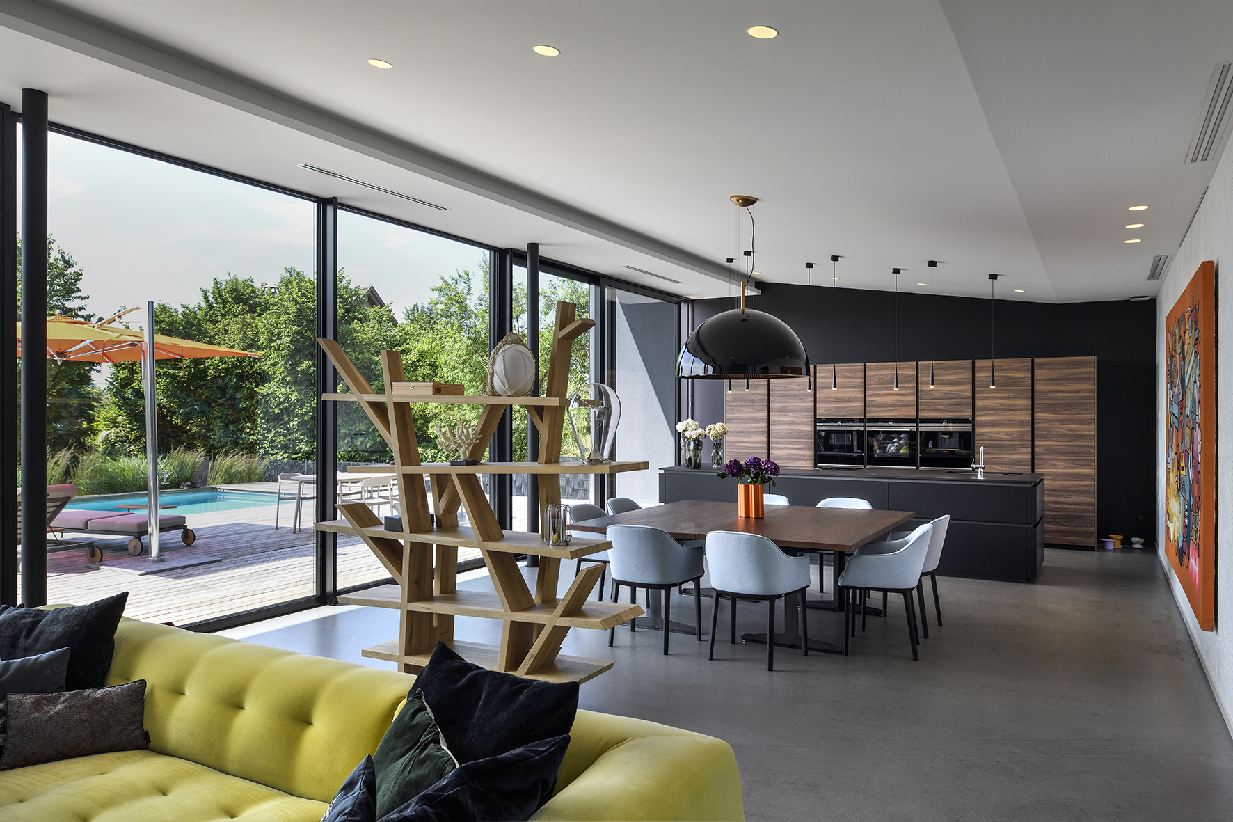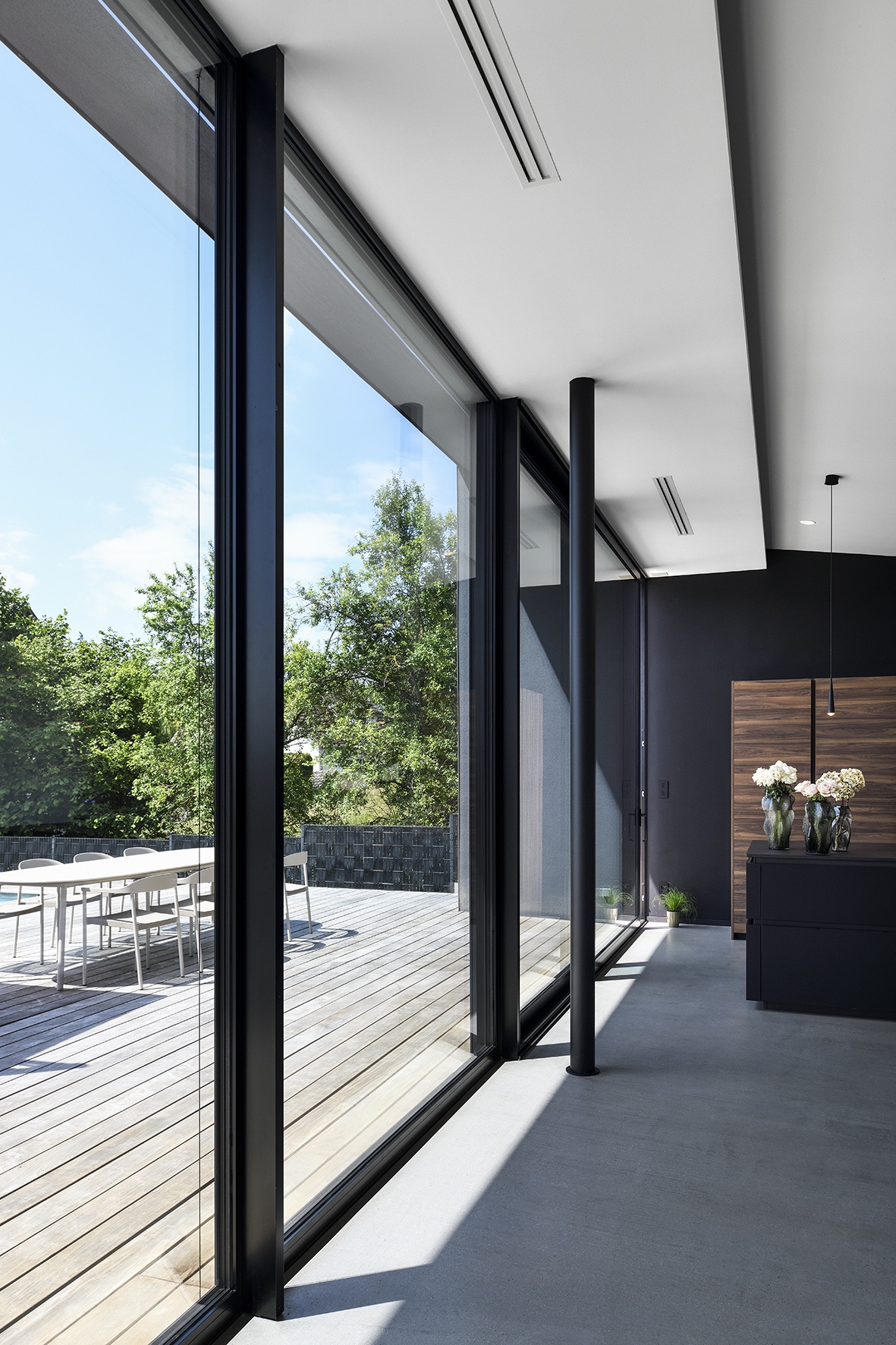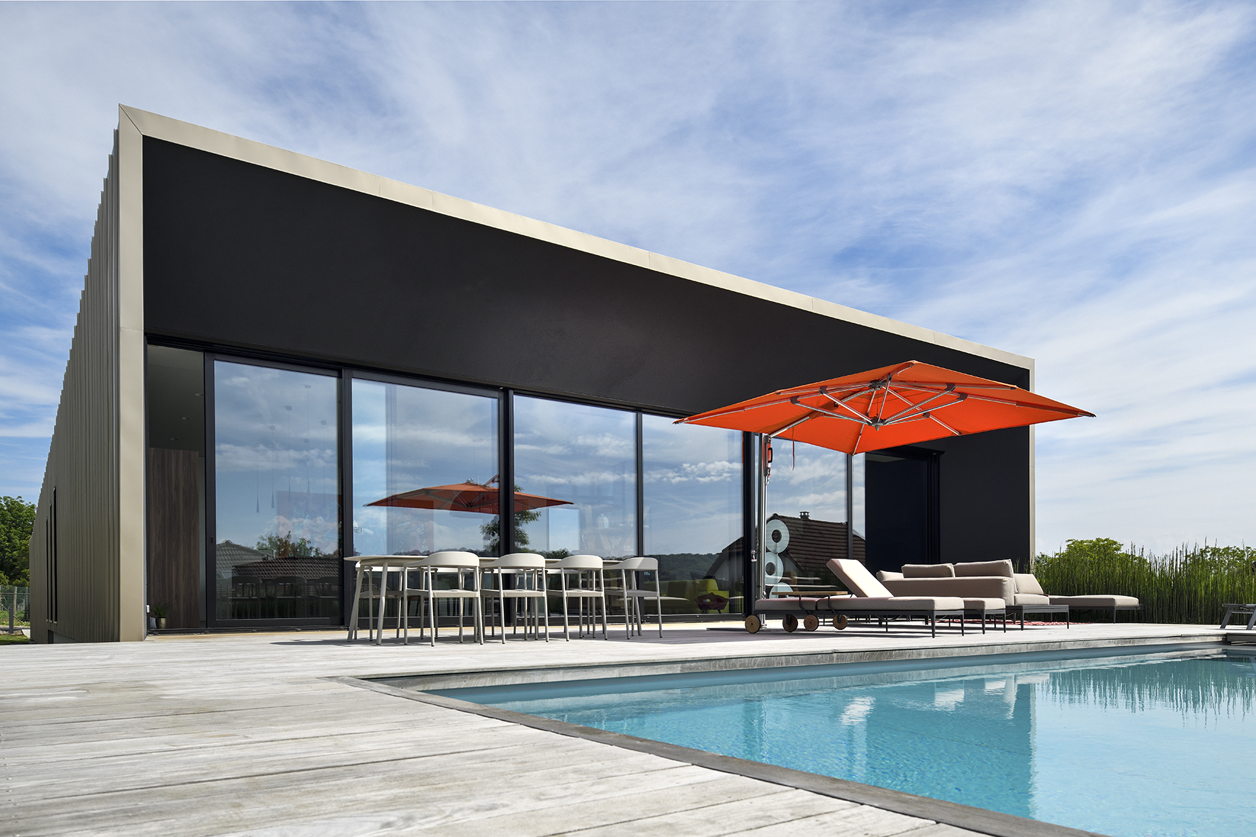 Les larges ouvertures vitrées cadrent les vues vers le paysage et dilatent les espaces intérieurs vers les jardins et la piscine.